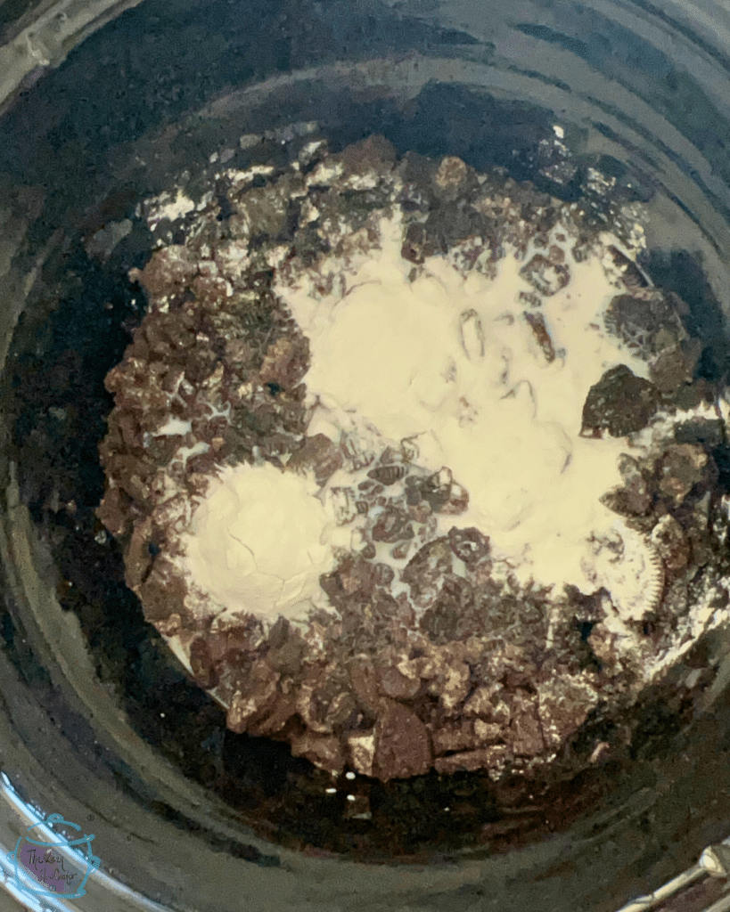 - Add crushed Oreos, 2 cups milk, and 3 tablespoon baking powder to greased slow cooker