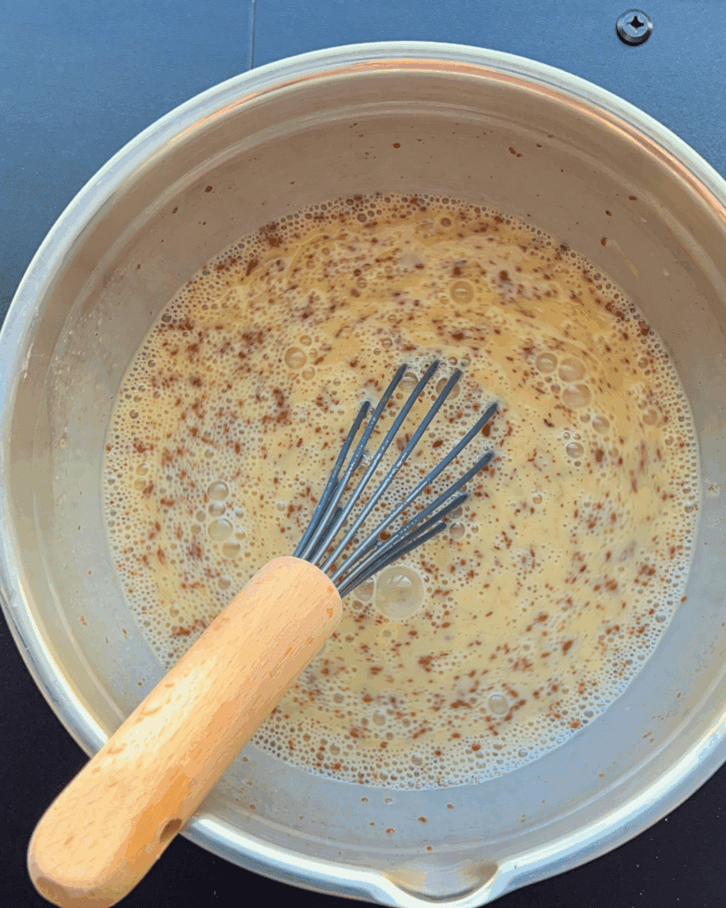 - Whisk together 6 eggs, 2 cups milk, ½ cup light brown sugar, 1 teaspoon cinnamon, and 1 teaspoon vanilla bean paste and set aside